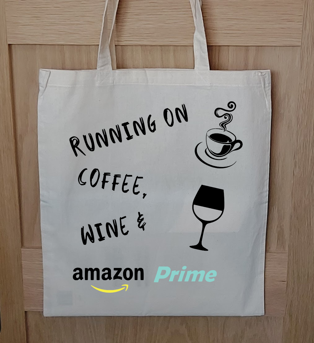 What keeps you fuelled during a busy day? Maybe you start with coffee, have a glass of wine in the evening and then do your shopping on 'Prime' when everyone else is bed.... if this sounds familiar, this is the bag for you! Design in black HTV with a cute yellow smile and blue 'Prime'.