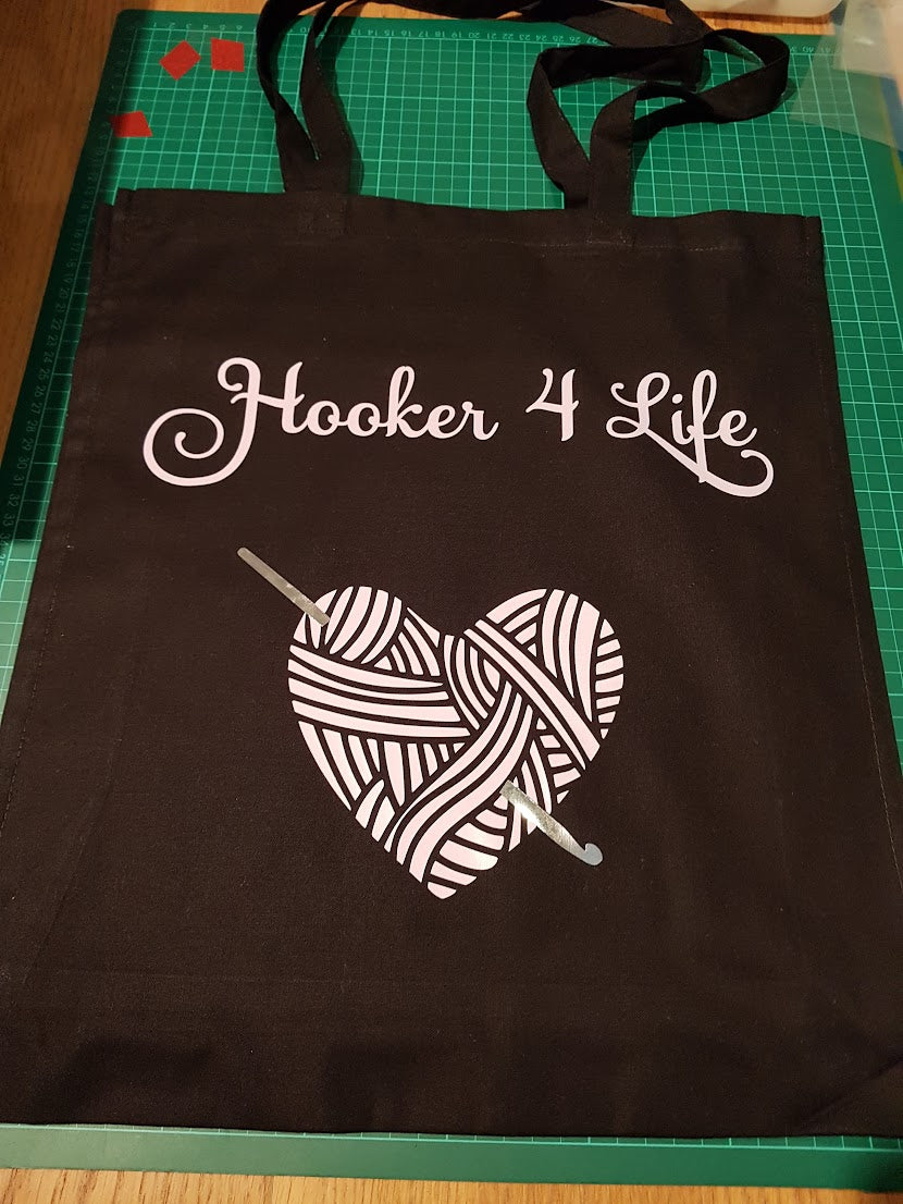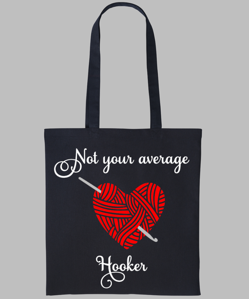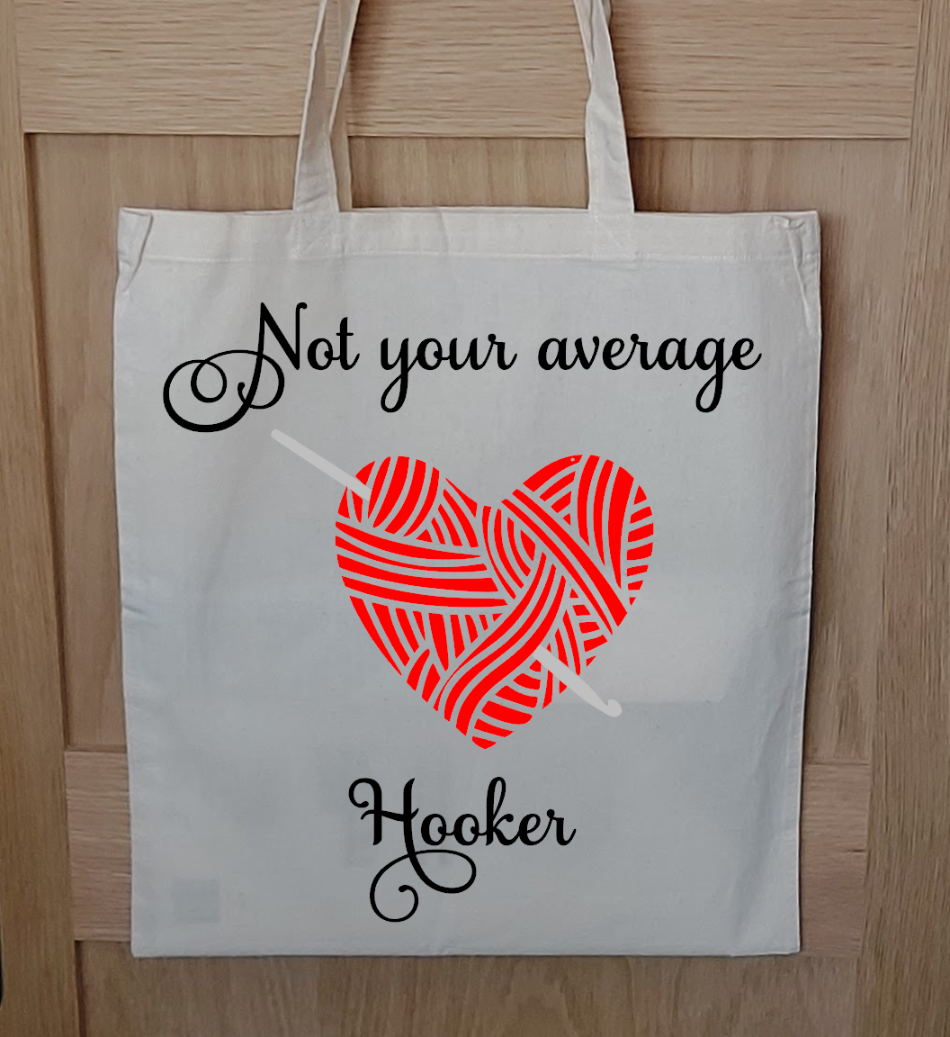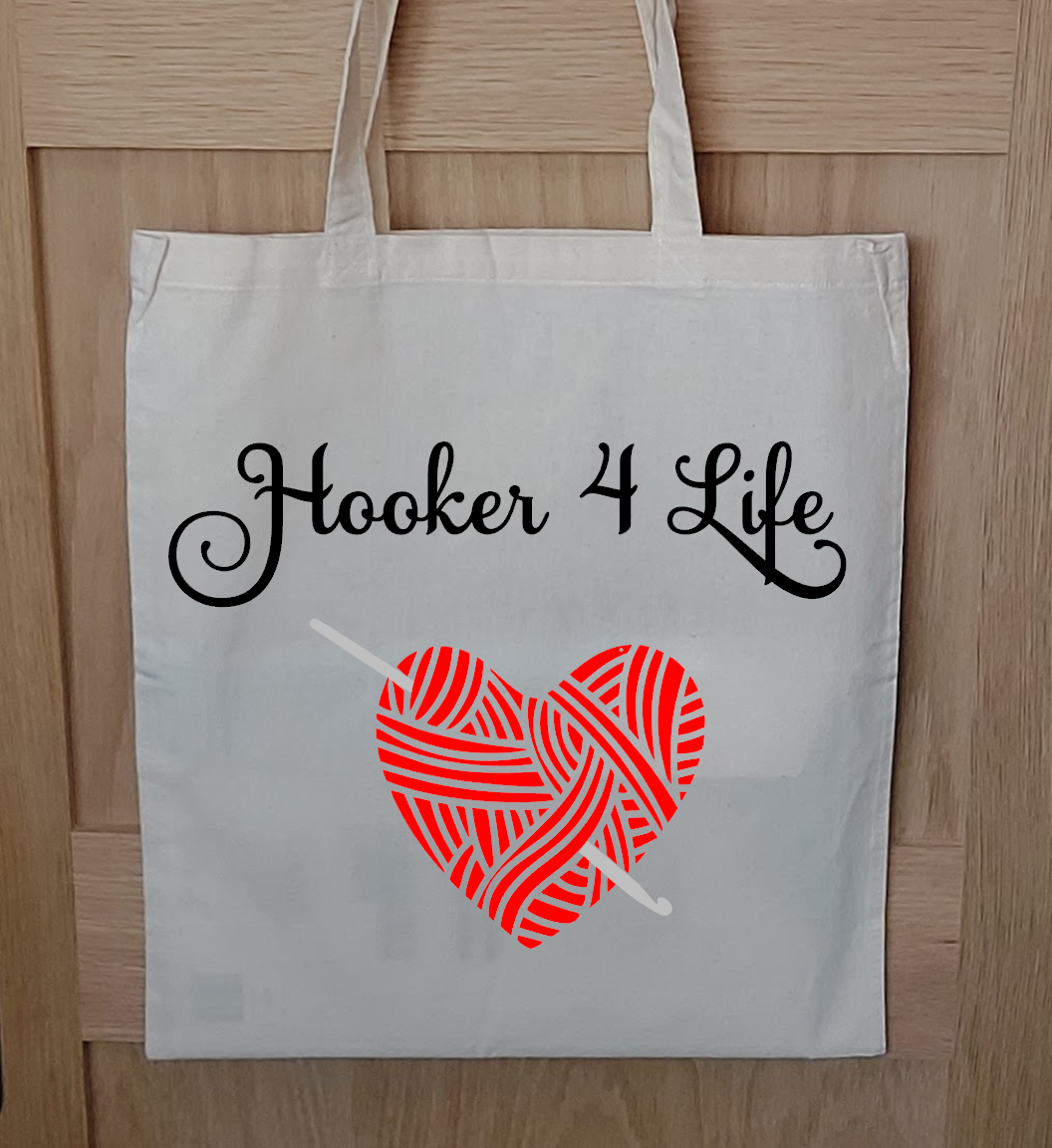 These crochet themed designs are made using gusseted tote bags. This means they open wider than my standard tote bags, allowing extra room for your latest project or more shopping space for your next haul of yarn!