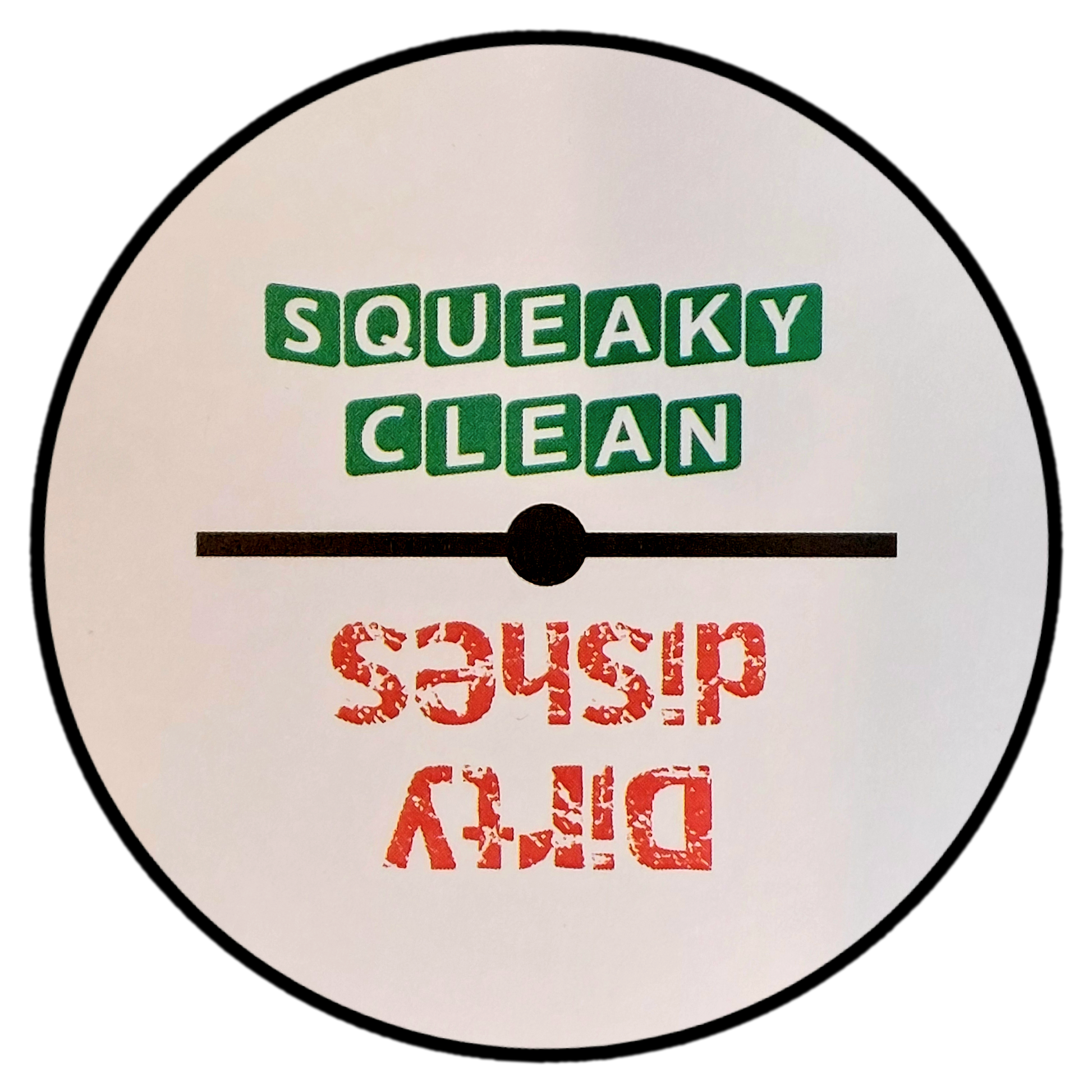 This design came along when I was playing with some new fonts. The black line in the middle reminds me of the raised turner in the middle of a control knob! Green print for 'SQUEAKY CLEAN' and a distressed red print for 'Dirty dishes'.