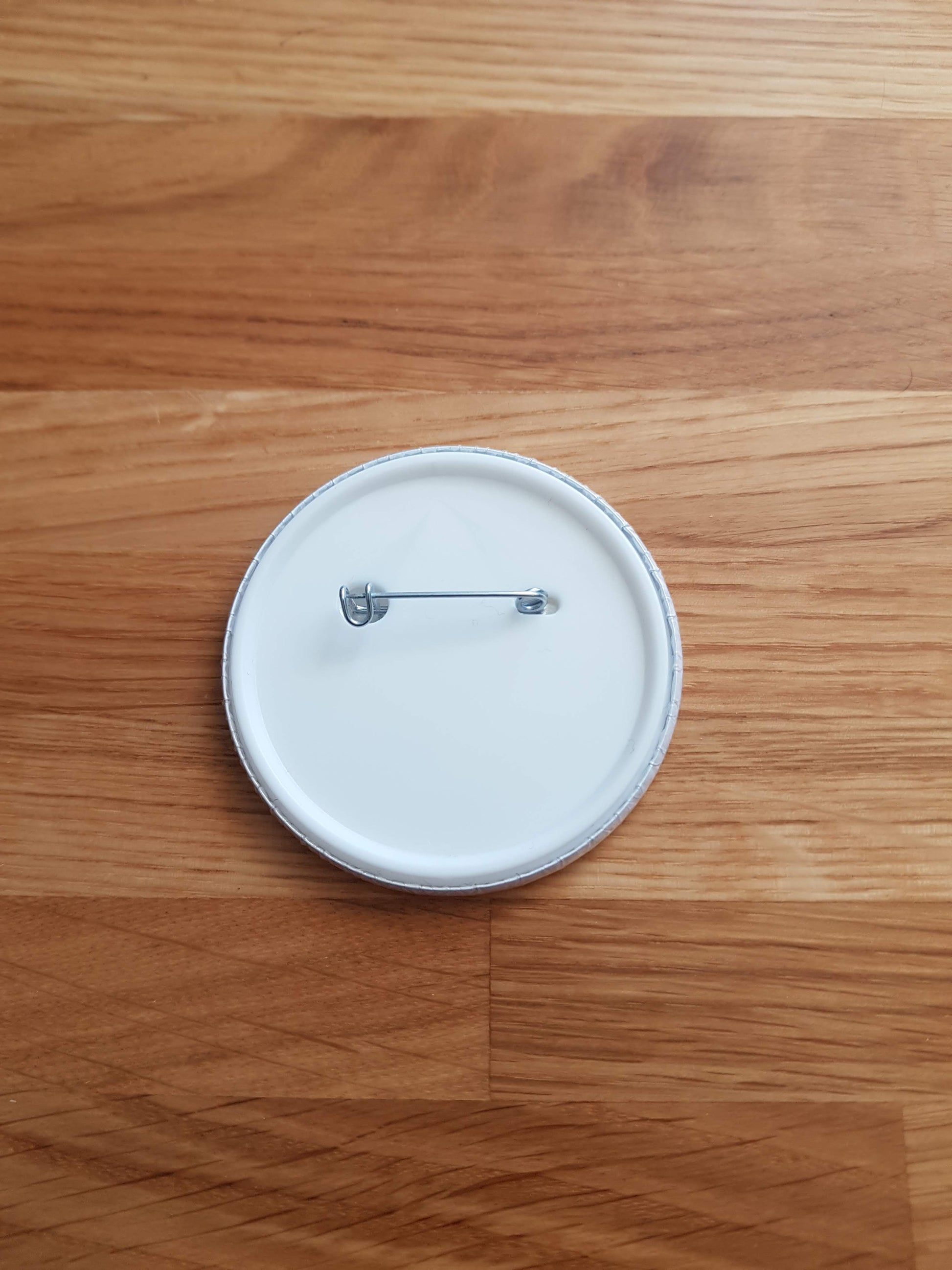58mm badge with plastic back and metal pin.