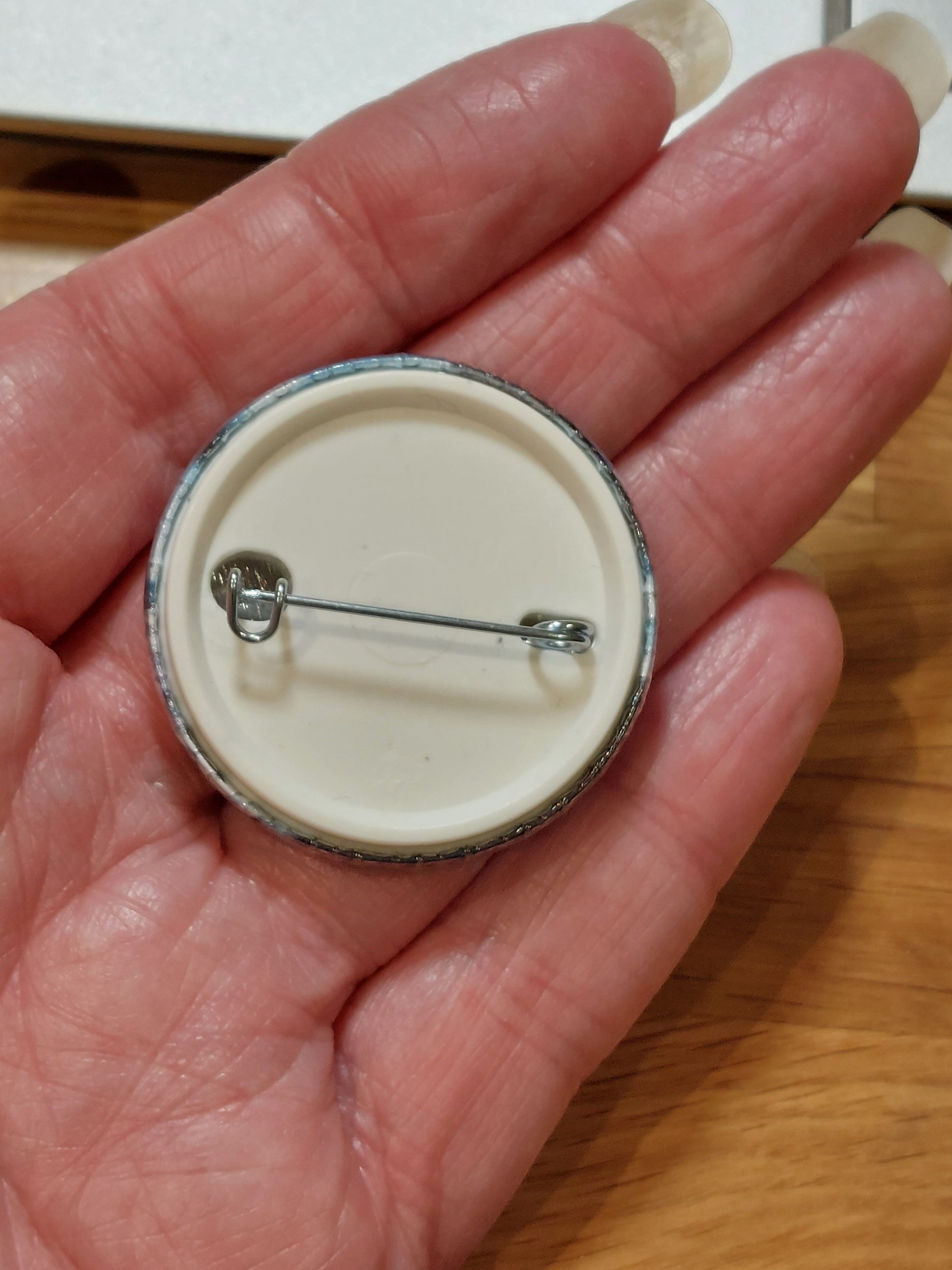 Printed onto good quality paper, assembled and hand pressed by myself using one of my professional badge makers. Badge is 38mm with plastic back and metal safety pin. Not a toy, not suitable for young children.