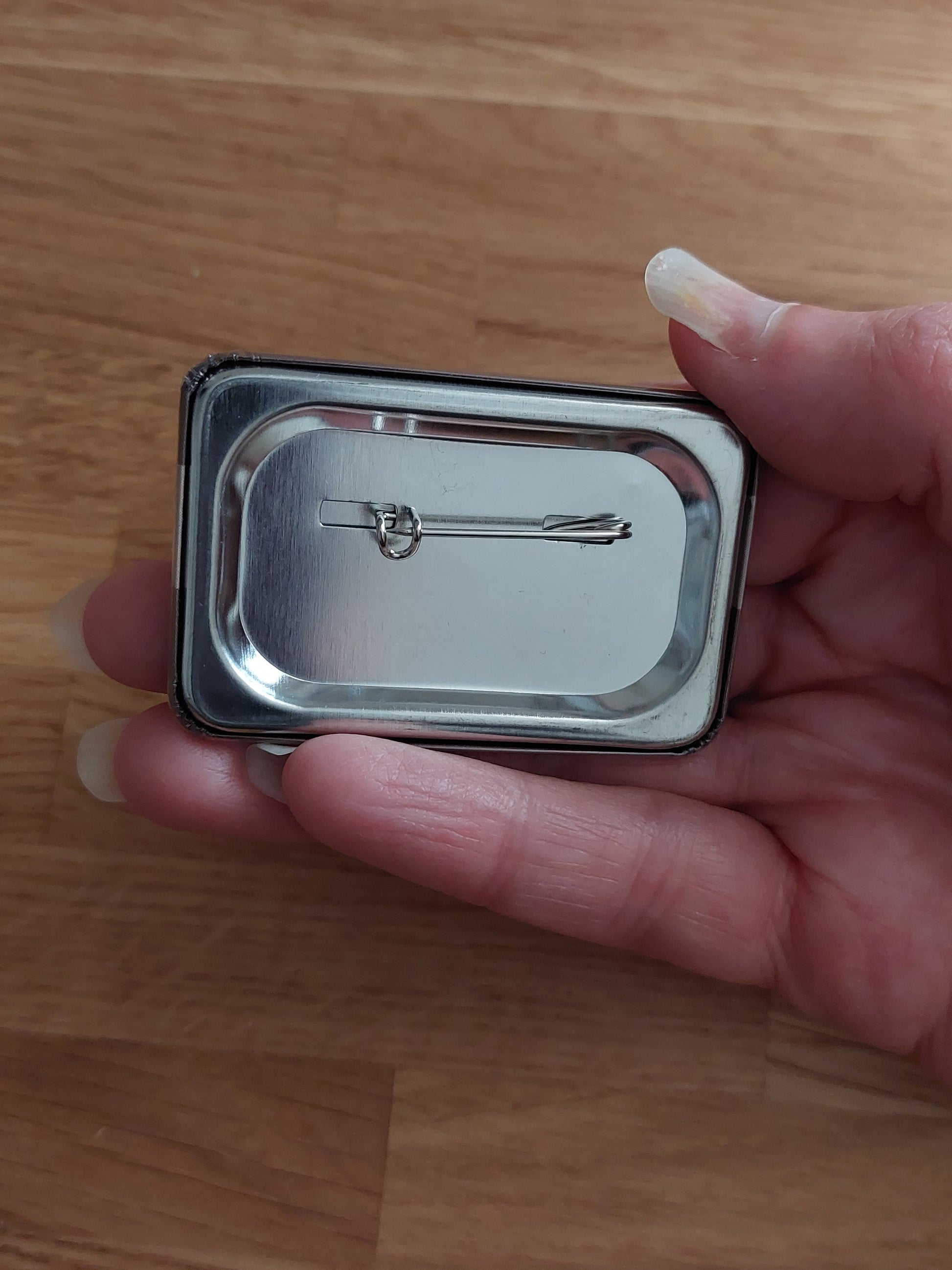 Rectangle badge, measuring approximately 59mm x 37mm. Metal back and safety pin.
