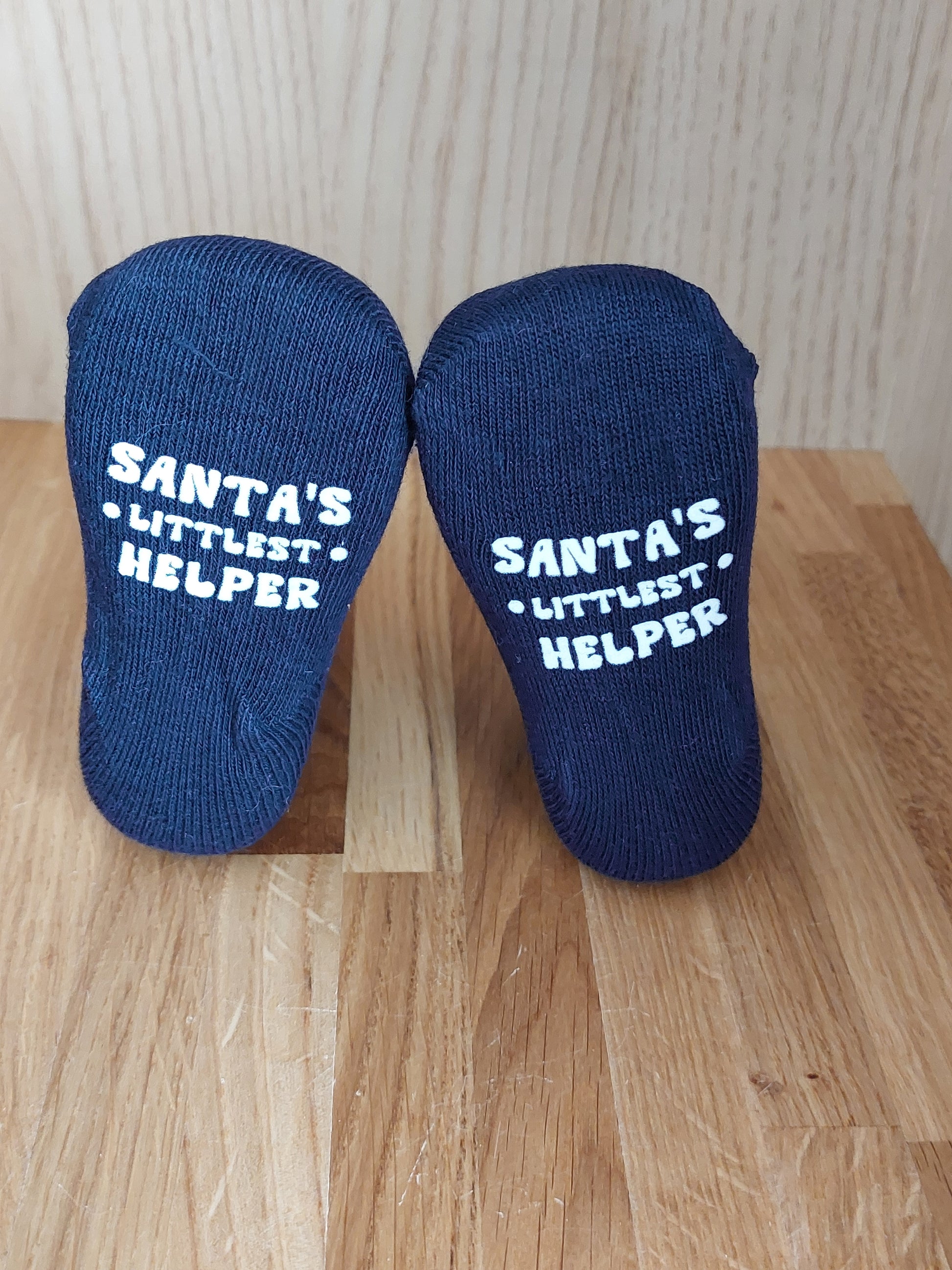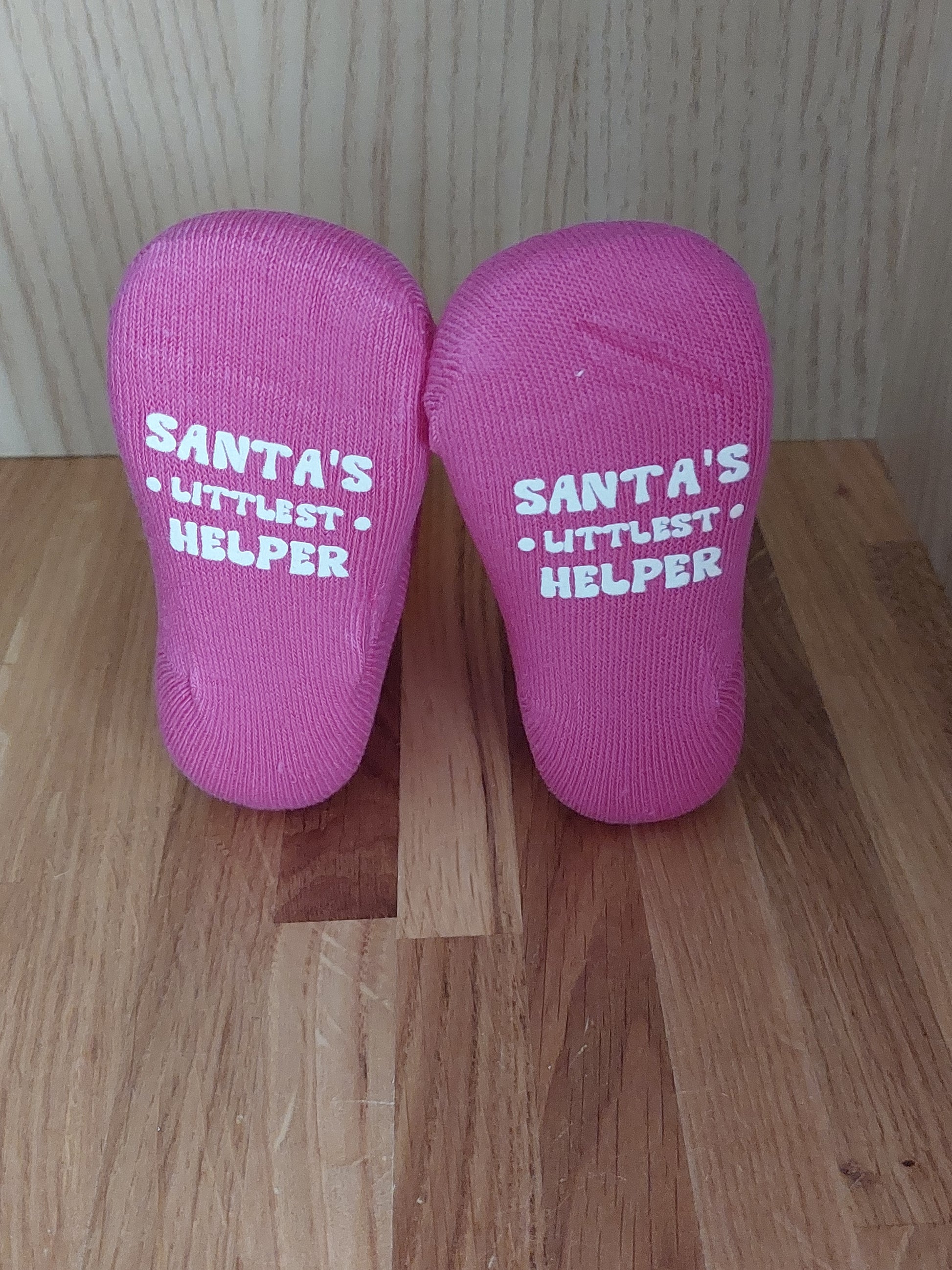 These baby socks are even more adorable because they are for Santa's "littlest" helper! The message, which is on the bottom of the socks, is made from soft flocked heat transfer vinyl.